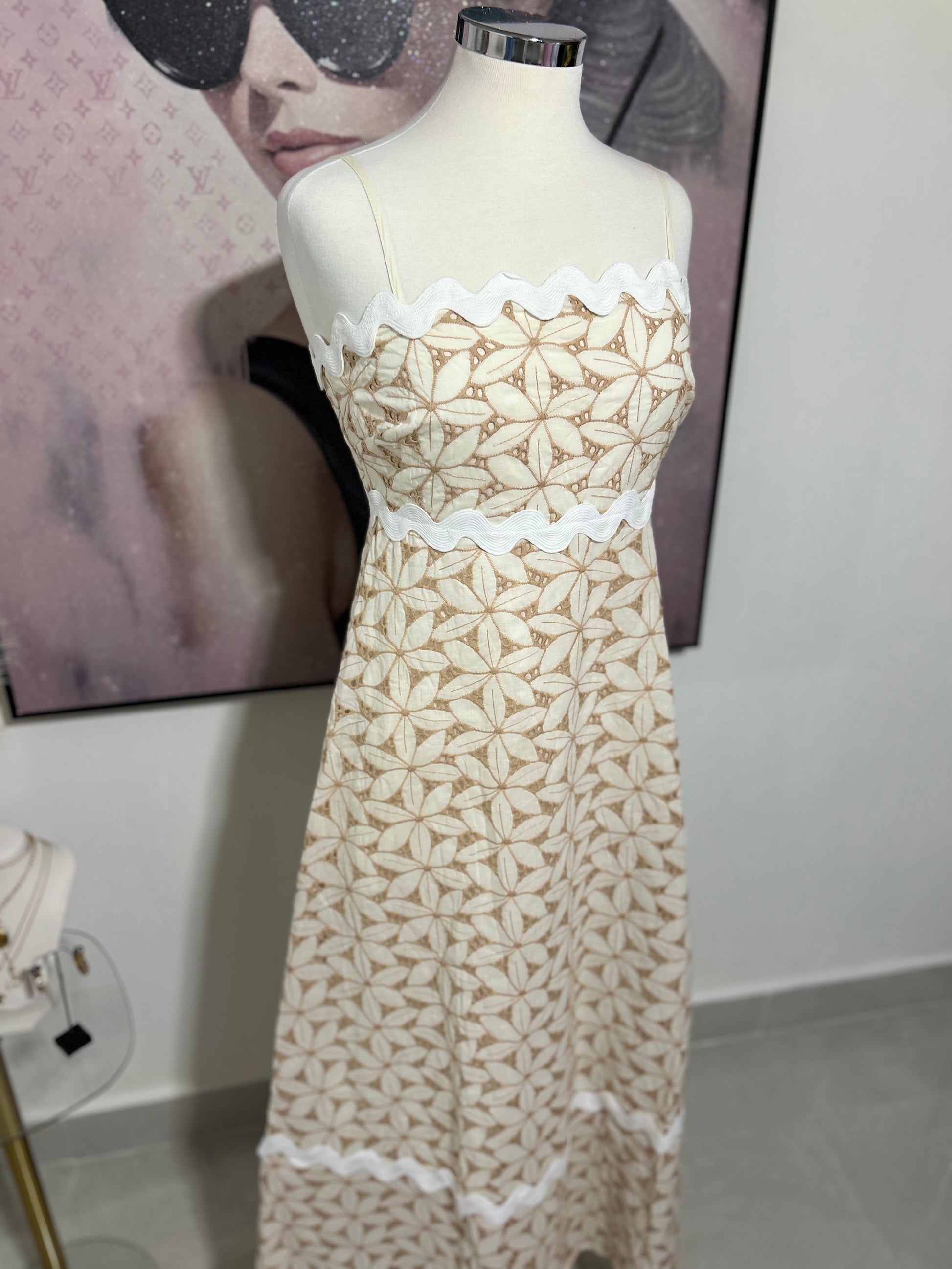 Siente la frescura del verano con nuestro Maxi Dress "Luna", una pieza que enamora a primera vista. Su estampado en tonos tierra combina perfectamente con los delicados detalles de ondas blancas, creando un balance entre lo bohemio y lo romántico. Ideal para días de brunch, salidas especiales o simplemente sentirte linda y cómoda.
